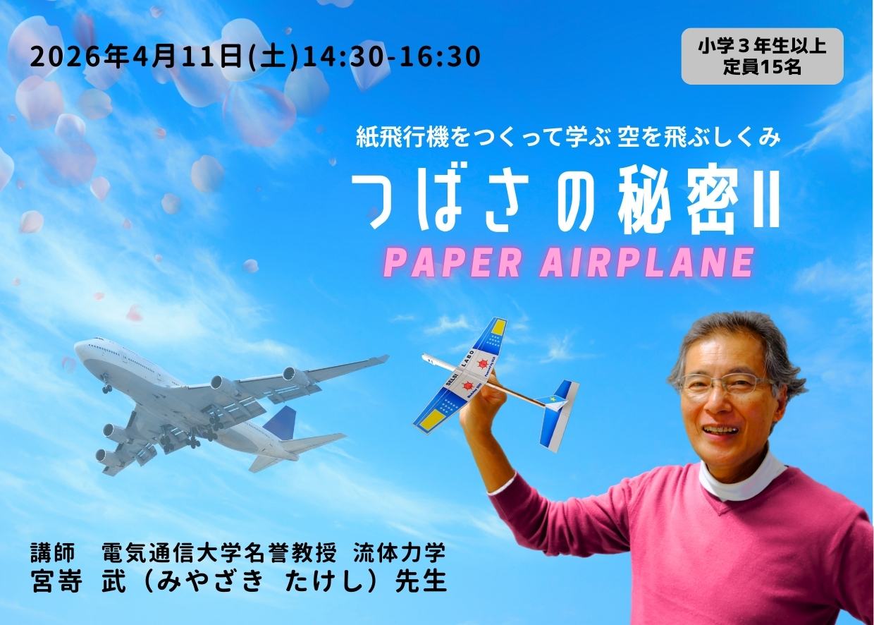 紙飛行機つくって、飛ばして、考える「空を飛ぶしくみ」のワークショップが新型機で帰ってきました。様々な紙飛行機の触察展示も併設します。宮嵜武名誉教授&鳥人間のお兄さん達と一緒に、楽しすぎる2時間だ!
